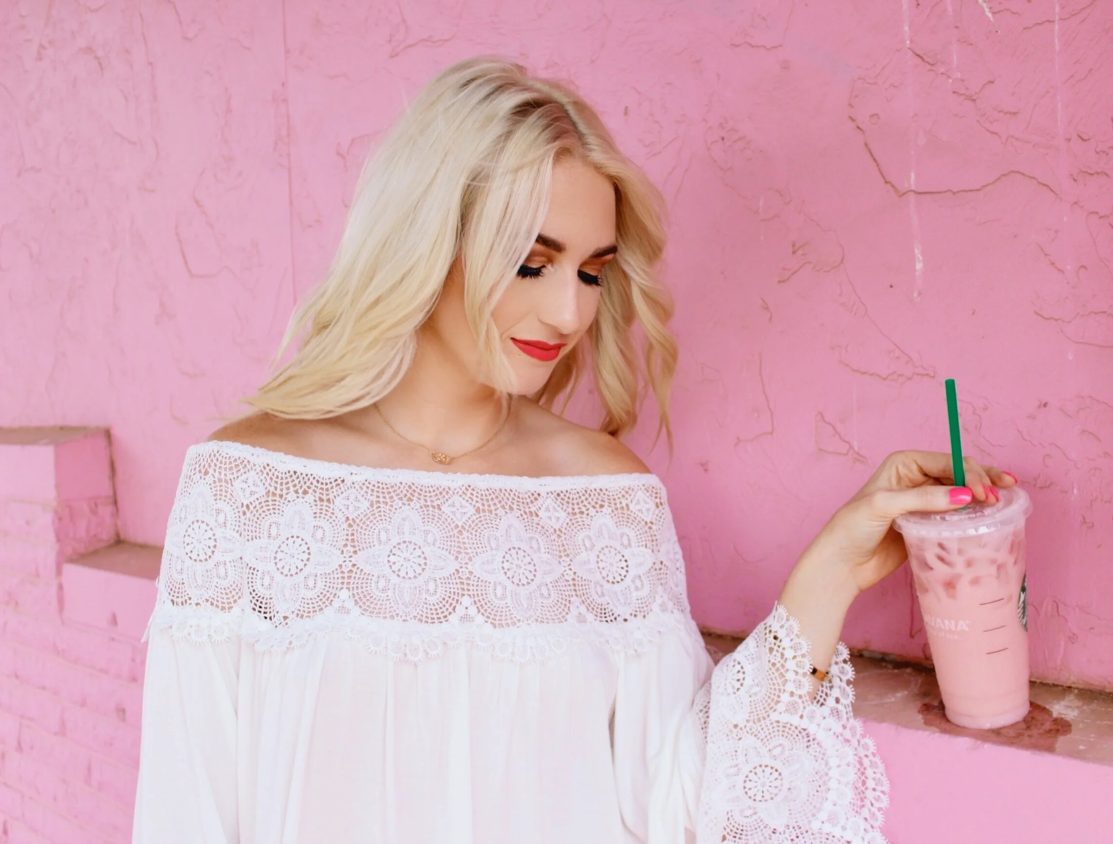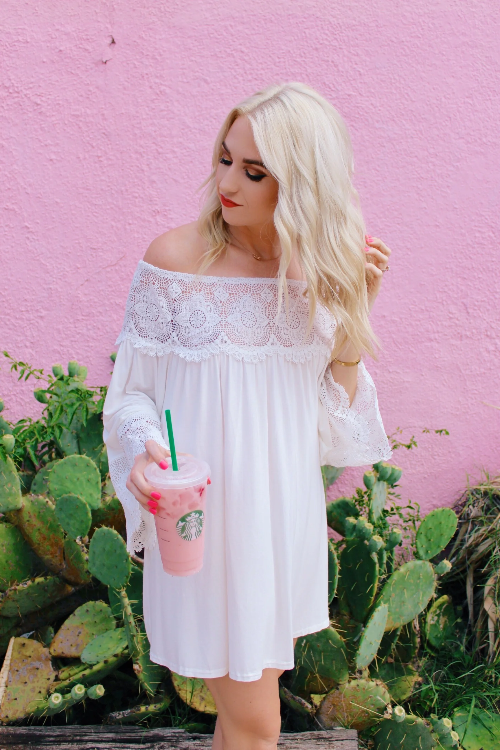 Is anyone else as obsessed with this Pink drink from Starbucks as me? It seriously taste like a pink starburst! Right now I am on a hard core no sugar no carb diet since me and Stephen are headed to Mexico in less than 2 months! So of course to keep my sanity I have one cheat meal and that pink drink was it this week! Now that it's summer time, it's out with the little black dress and in with the little white dress! I love this one from Impressions boutique! The lace detail and bell sleeve sold me. It's so comfortable and it was less than $50! This dress is perfect for brunch on Sunday's or a bride to wear for her bridal shower! If you have a long torso and long legs this dress might be to short and need to be paired with a skinny jean. I have an unusually short torso so it worked as a dress for me. I paired it with these blue strappy heels from The clothing bar. These shoes were also under $50 and with the heel being a little shorter and chunky it made them comfy and easy to walk in. You can't find these shoes online but if you call the clothing bar and tell them I sent you then they will ship them to you! I hope everyone is having a great Tuesday!! 💙💙